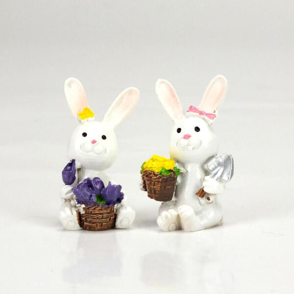 Mosolygós húsvéti nyuszi figurák, kertész stílusban. Virágokkal teli kosarakkal tökéletes dekorációk a szezonra.